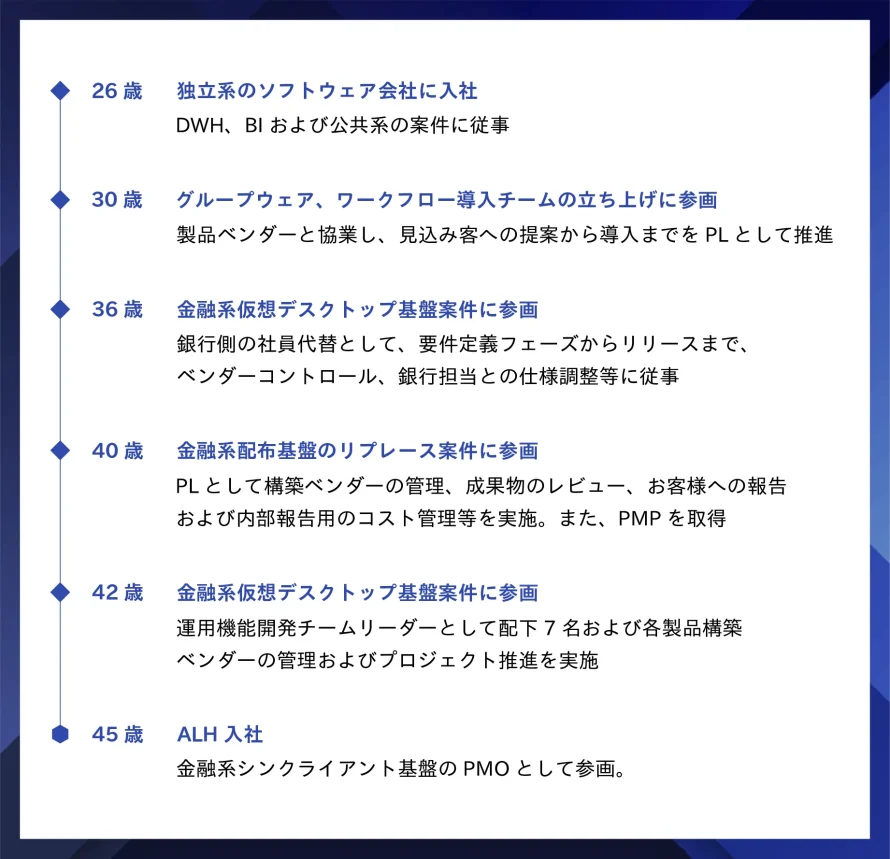 要件定義からリリース、運用まで幅広い工程を経験し、PL/チームリーダーとして組織やベンダーを動かしてきました。