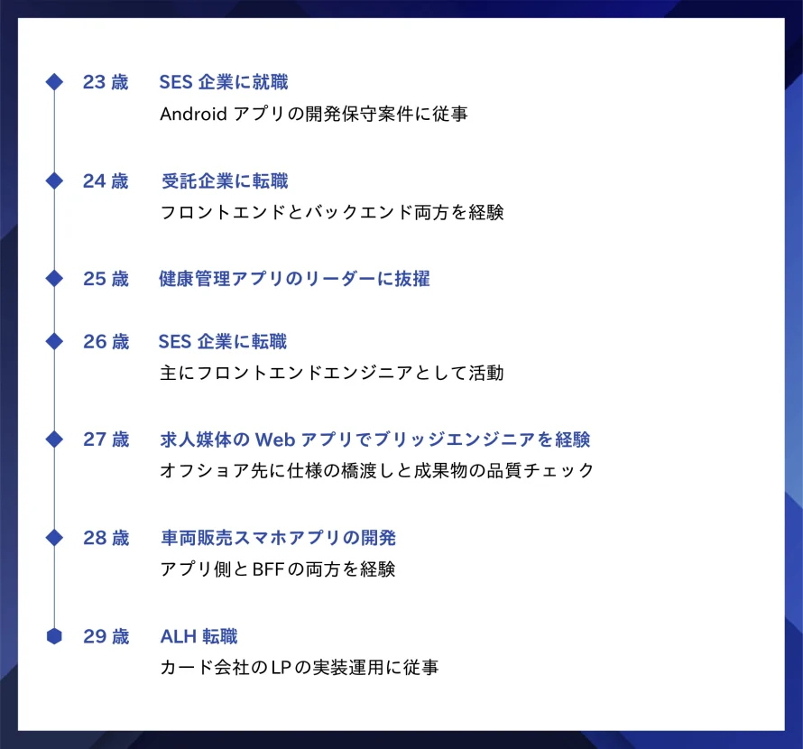 キャリアとしては、SES→受託開発→SES→ALHという流れで、いまが4社目です。