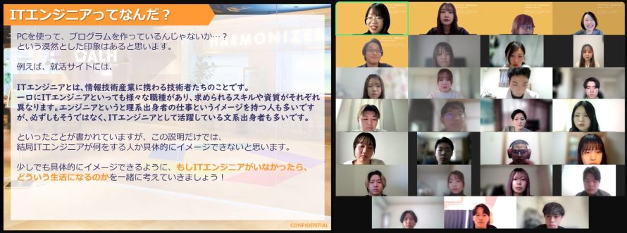 次に、ITエンジニアについて理解を深めるために「なぜ、ALHはITを生業にしているのか?」「なぜ、IT未経験者を採用しているのか?」をグループワークで考えたり、ALHの企業理念や存在意義をお話ししました。