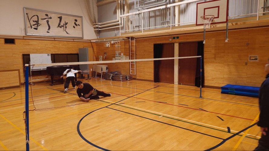バドミントン未経験者や久々の運動というメンバーが多いためか、みんな腰の位置が高い高い。